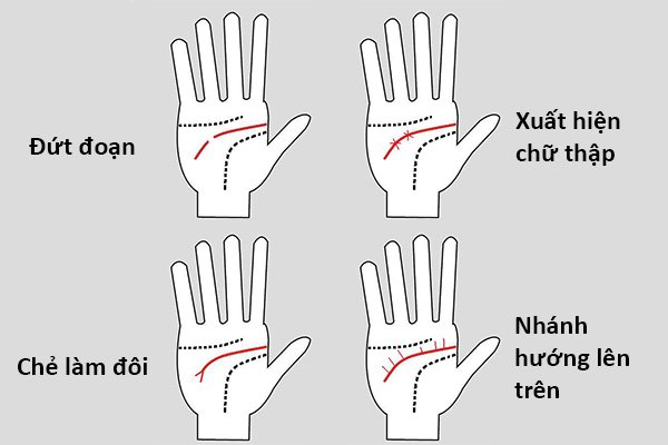 - Đường tình duyên bị đứt đoạn: Khi đường tình duyên không liền mạch mà bị cắt đứt, đây là biểu hiện của những trục trặc trong các mối quan hệ tình cảm, chuyện tình yêu gặp nhiều sóng gió, thậm chí là chia ly.