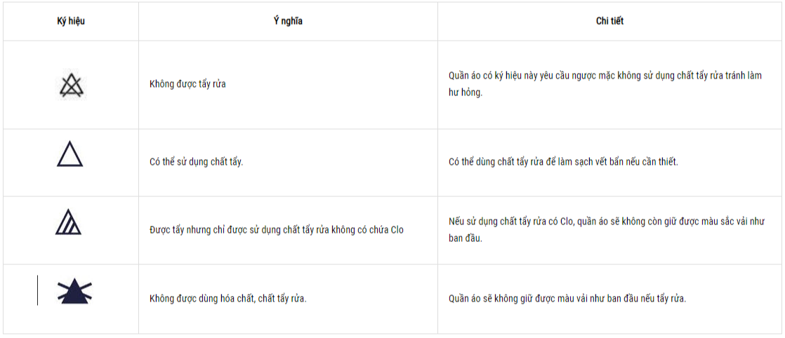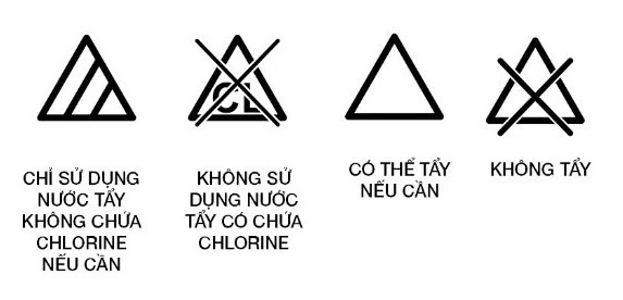 - Cấm sử dụng chất tẩy: Biểu tượng này có dạng hình tam giác bị gạch chéo, nhắc nhở bạn không được sử dụng chất tẩy trong quá trình giặt. Hãy sử dụng nước sạch hoặc sản phẩm tẩy rửa dịu nhẹ dành riêng cho loại vải này để loại bỏ vết bẩn, .