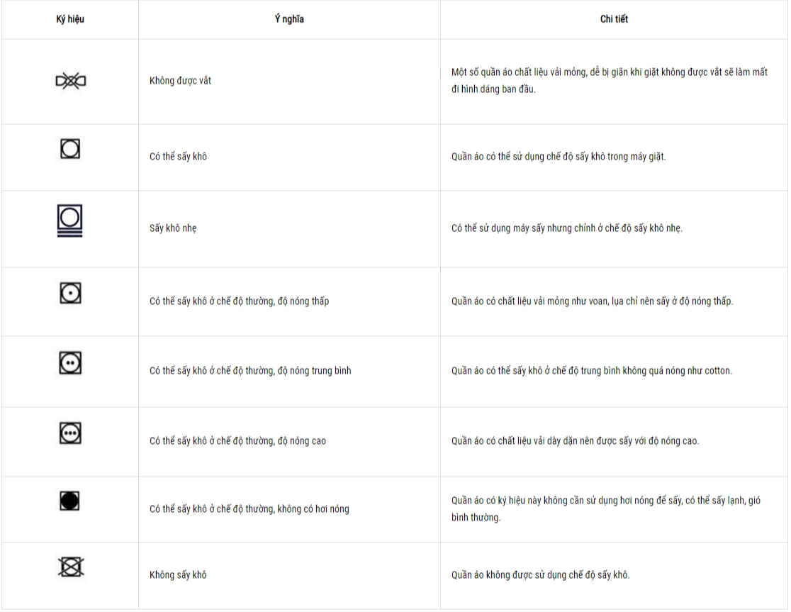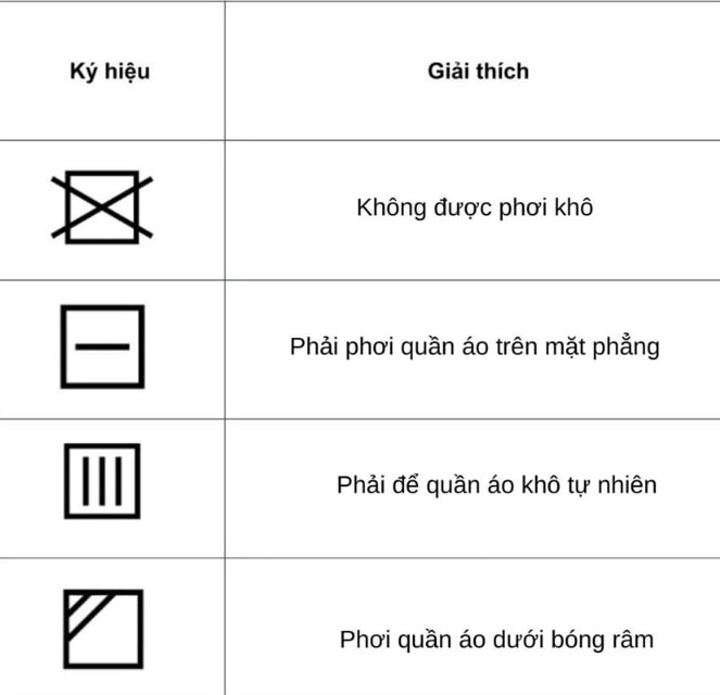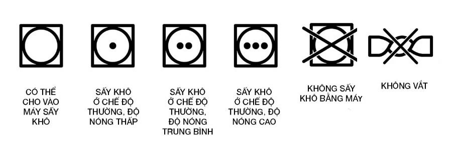 - Hình vuông có một vạch ngang: Cấm sấy khô trong máy.