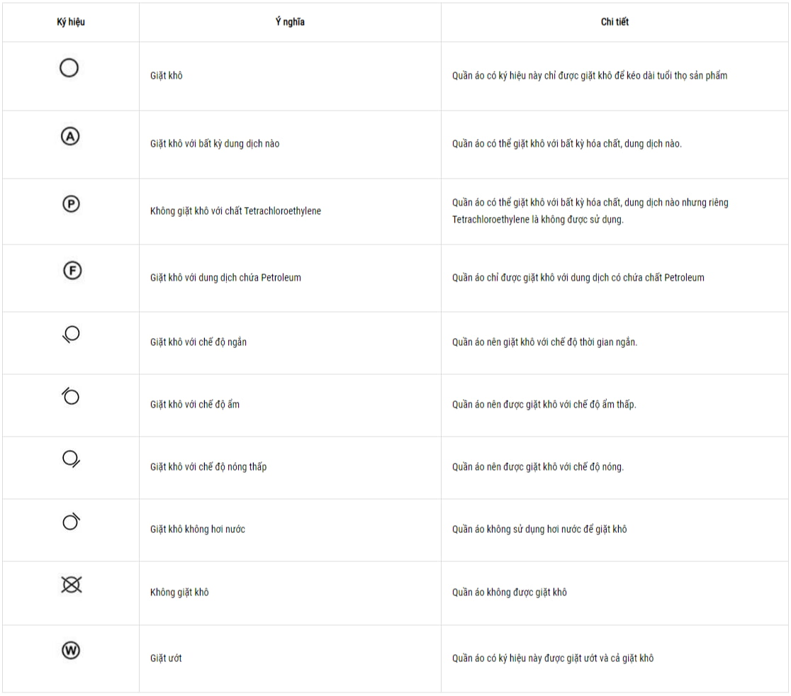 - Điều đó báo hiệu rằng quần áo này cần được giặt khô. Điều này đồng nghĩa với việc quần áo không nên được giặt trong nước.