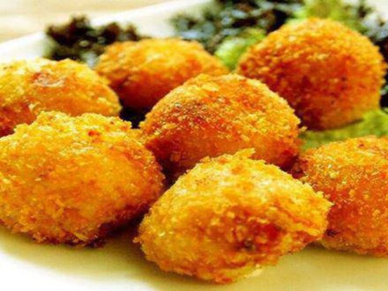 - Lăn qua một lớp bột mì, nhúng vào bát lòng đỏ trứng gà, sau đó lăn đều với bột chiên giòn.