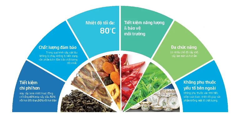 Công nghệ sấy nhiệt bằng bơm nhiệt heat pump điều chỉnh nhiệt độ thấp và trung bình từ 15°C – 50°C/ 60°C/ 80°C gần giống với tự nhiên. Không làm giảm chất lượng sản phẩm khi sau khi sấy, không phân huỷ, không bị oxi hoá, không mất màu sau khi sấy và khử nước, ít thất thoát chất dinh dưỡng và bảo quản được trong thời gian dài so với các thiết bị truyền thống.