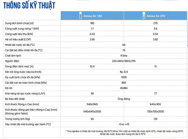 Thông Số Kỹ Thuật của Heat Pump ATMOS Air bình chứa 270 lít