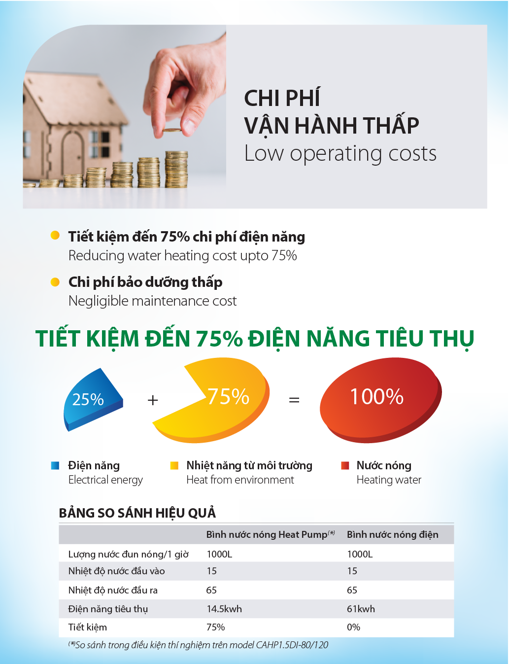 - Tiết kiệm đến 75% chi phí điện năng tiêu thụ: Với công nghệ bơm nhiệt làm nóng nước tiên tiến sẽ giúp gia đình bạn tiết kiệm tới 75% chi phí điện năng tiêu thụ nhờ cơ chế hập phụ nhiệt năng từ môi trường.