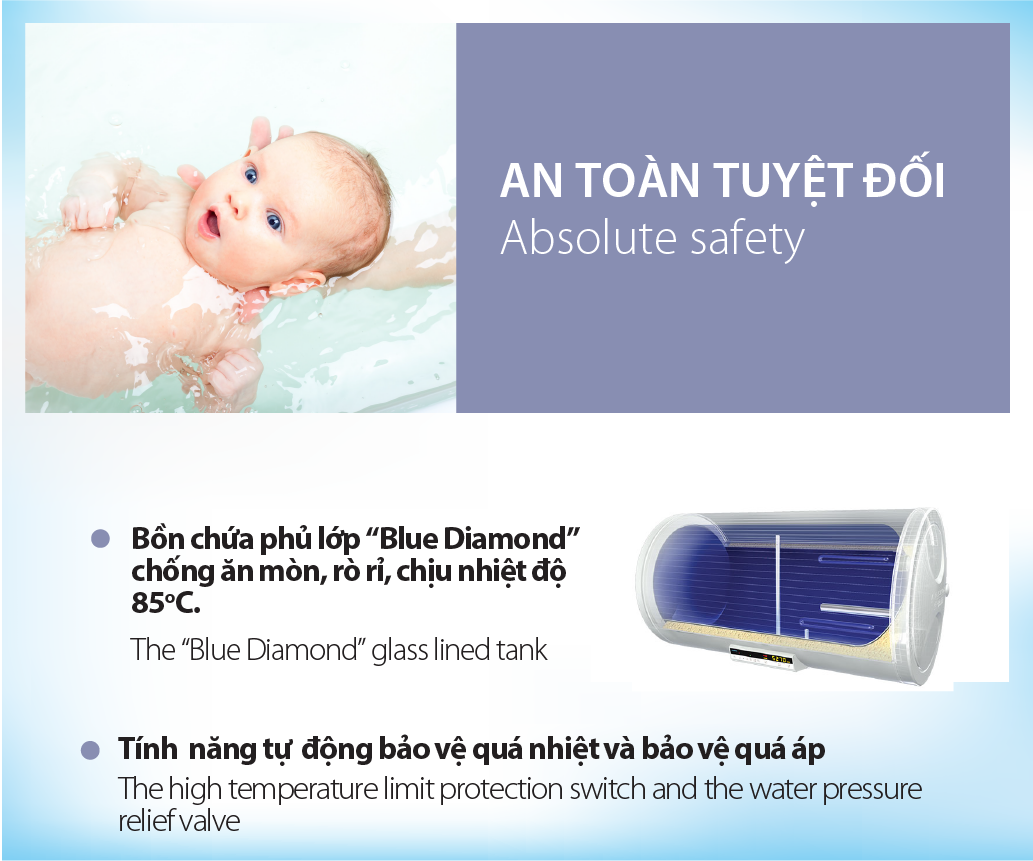 - An toàn tuyệt đối: Máy Nước Nóng Bơm Nhiệt A. O. Smith CAHP-1.5HP sử dụng công nghệ phủ Blue Diamond chống ăn mòn, chống rò rỉ và chịu nhiệt 85 độ C. Ngoài ra máy còn tích hợp tính năng tự động bảo vệ quá nhiệt và quá áp.