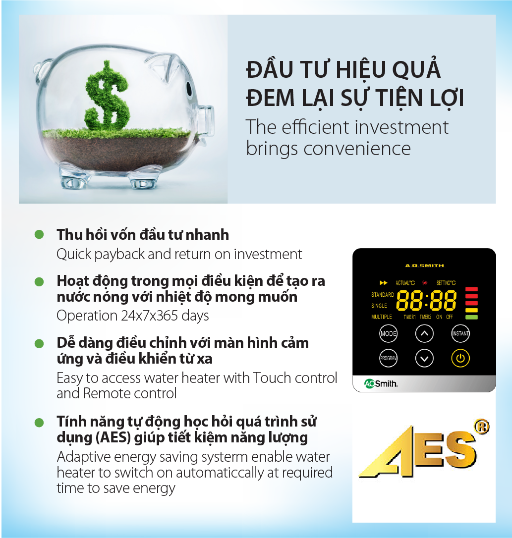 - Dễ dàng điều chỉnh với màn hình cảm ứng và điều khiển từ xa: Tính năng tự động học hỏi AES trong quá trình sử dụng giúp tiết kiệm năng lượng. 03 chế độ vận hành linh hoạt: Tiết kiệm/Tiêu chuẩn/Làm nóng nhanh