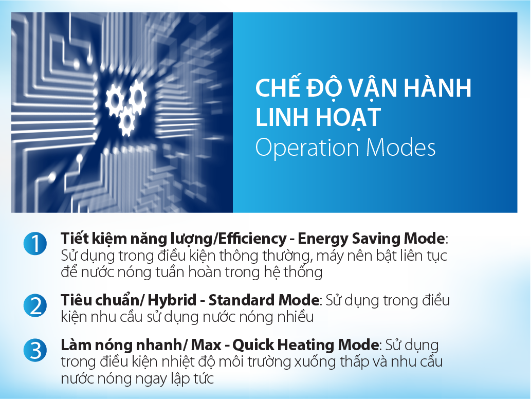 - Hoạt động liên tục trong mọi điều kiện thời tiết: 24x7x365 ngày/năm: Hoạt động liên tục trong mọi điều kiện thời tiết để tạo ra nước nóng với nhiệt độ mong muốn.
