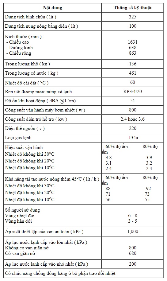 BẢNG THÔNG SỐ KỸ THUẬT MÁY NƯỚC NÓNG BƠM NHIỆT ( HEAT PUMP ) RHEEM 551325