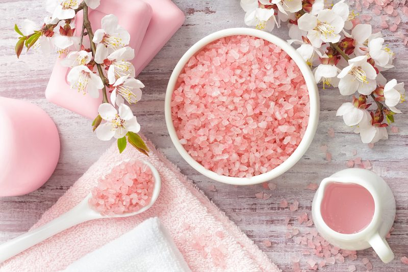 - Đổ 4-5 muỗng muối hồng và vài giọt tinh dầu vào bồn tắm có nước ấm.