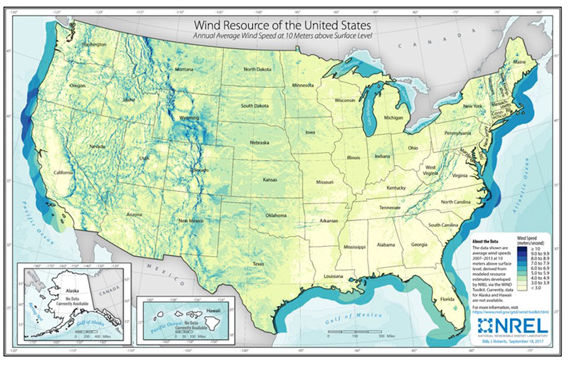 Những bản đồ này cho thấy chiều cao quan trọng như thế nào. Lấy Nebraska làm ví dụ. Ở độ cao 10m so với mặt đất, tốc độ gió trung bình khoảng 4-4,9 m/s. Điều này gần với khả năng tồn tại của tuabin gió. Ở độ cao 40m, tốc độ gió trung bình tăng lên khoảng 6-6,9 m/s. Và ở 80m, tốc độ của nó lên đến 7-7,9 m/s.